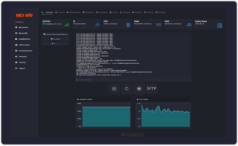 Găzduim toate serverele noastre de jocuri pe panoul de control Pterodactyl modificat. Aceasta este o suită de control dovedit fiabilă și consistentă. Am personalizat fiecare șablon de joc pentru a oferi funcții și programe de instalare unice.